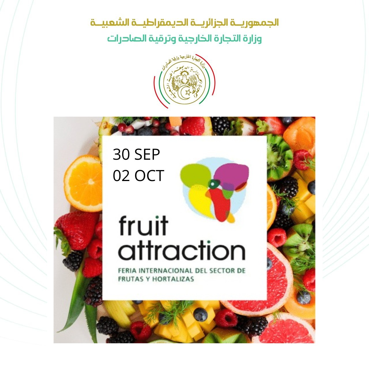 تحت إشراف وزارة التجارة الخارجية وترقية الصادرات، تشارك الجزائر في فعاليات الطبعة السابعة عشرة للمعرض الدولي للفواكه والخضروات وتقنيات الزراعة الحديثة “فروت أتراكشن”، المزمع تنظيمه بالعاصمة الإسبانية مدريد من 30 سبتمبر إلى 2 أكتوبر 2025.